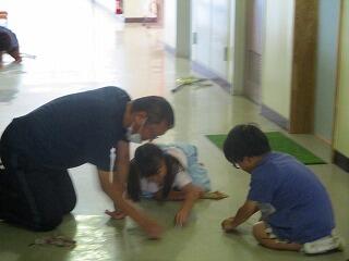 縦割りで清掃しているので,上の学年の児童が下の学年に手順や方法を教えていきます。