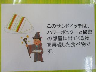 待ちに待った,給食の時間です。図書委員の児童が「ハリー・ポッターと秘密の部屋」でマクゴガナル先生が杖を振り上げると,大きなサンドイッチと冷たい魔女かぼちゃジュースが現れるシーンのメニューです。