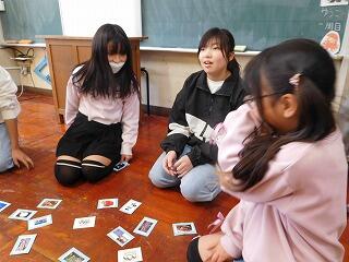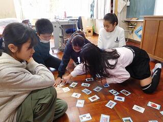 ALTが、みんなのために英語のかるたを用意してくれました。帰りの時間に5年生でやりました。今まで習った英語を聞き取り、言われているお題のカードを取ります。