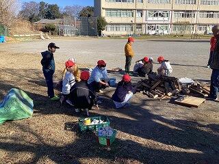 ③たき火を準備しています           ④焼きあがったイモを均等に切っています