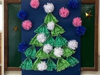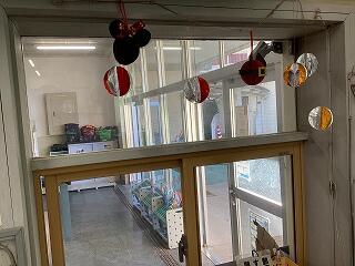 ◎学校玄関は、クリスマス仕様になっています。事務補助さんの作品です。