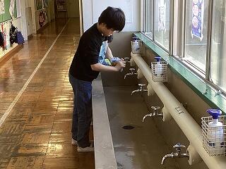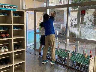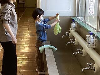 約8か月使用した教室の大掃除をしました。机など全て廊下へ出し、床にワックスをかけました。ワックスのにおいに関心を示していました。薄く、上手にのばしてワックスをかけていました。