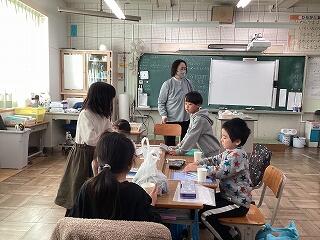 4年生 江原教諭の指導の下で、藍染を行いました。思い思いの絞りの手提げバッグができました。