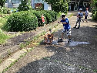 4年生は校庭で「昔のくらし」をテーマにした社会科学習を行いました。