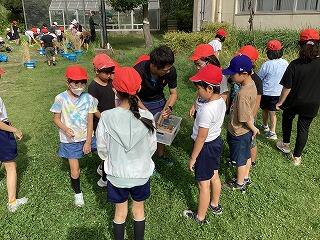写真の左の方で、1年生の数人が校庭で網をもって虫取りをしていました。なかなか捕まえられず、困っていたところ、5年生の男子3名が虫の捕獲を手伝っていました。さらに、虫かごに捕った虫を入れてあげていました。