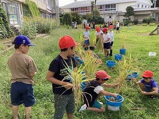 3年生は、個人バケツの稲だけでなく、学級で育てている稲も同時に刈り取りました。米はなかなかの出来具合に見えました。これから脱穀・乾燥・籾摺りをして、ようやく米(玄米)とご対面です。楽しみです。