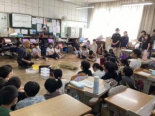 バケツの周りにはたくさんのバッタがいたので、捕まえようとする児童が見られました。また、バケツの中には、トンボのヤゴとトンボ(上写真)がいました。稲づくりをとおして、様々な道具や稲に関わる生き物たちと深いつながりがあることを学んだことでしょう。