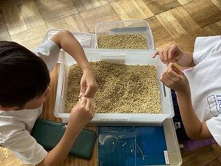 今週月曜日にバケツ稲刈りを行いました。今日は4・5・6年生が稲の脱穀をしました。H教諭の指導で、割りばしを使った簡易脱穀を行いました。