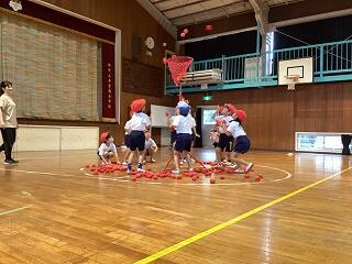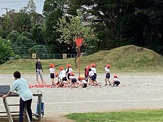 今日から体育館のアリーナ部分の使用ができるようになりました。早速、1・2年生の玉入れの練習を体育館で行いました。