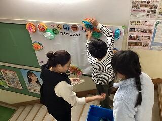 居住地交流事業で、県立我孫子特別支援学校から児童1名の訪問がありました。たんぽぽ学級の児童は交流児童と一緒にタオル染色を行いました。仕上がりが楽しみですね。