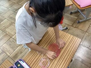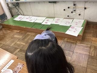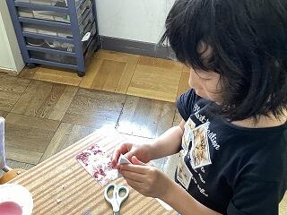 育てているアサガオの花弁から色を取り、和紙を様々な形に切って色を付けています。