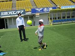 まず,試合で使用したサッカーボールに選手のサインが書かれたものを贈呈していただきました。