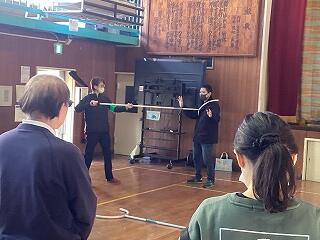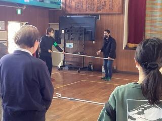 講話後、先生方に向けて「さすまたの使い方」を教えていただきました。