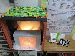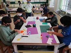 工作クラブ:今日は,ハロウィンをテーマにした切り絵を作成しました。カボチャやクモの巣などを色紙でつくり,台紙に貼っていきます。