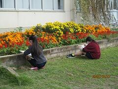 5年生は今日も家庭科と図工で半々に分かれて学習に取り組んでいます。図工を学習するグループは,さわやかな秋空の下,校庭で風景画に取り組んでいます。校庭の自然を自分の視点で描いていきます。みんな真剣に取り組んでいます。