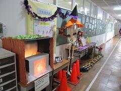 職員室前廊下に期間限定でハロウィンのディスプレイが設置されています。マントと帽子をまとったスケルトン(ガイコツ?)のお隣に,最近,「白雪姫」が仲間入りしました。