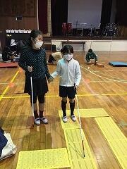 白杖を持ち,点字ブロックを頼りに歩いてみました。目が不自由ということがこんなにも大変なのかということがわかりました。