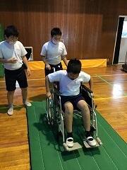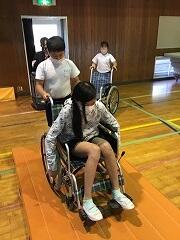 実際に車椅子に乗ってみました。ほんの数センチメートルの段差を乗り越えるのも大変でした。車椅子を押し方にもコツ(乗っている人が安心できるかどうか等)があることもわかりました。