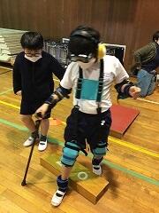 ひざサポーターやおもり,ゴーグル,背曲げエプロン等の高齢者体験セットを装着して高齢者体験をしました。体が思うように動かずに,ちょっとした段差をこえるのも大変でした。