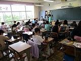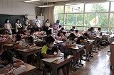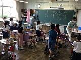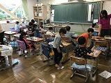 2年生,今日の国語は,漢字の練習です。先生の声とリズムに合わせて,全員で一斉に「空書き(そらがき)」をします。書き順やはらい,とめ,はねなどの字形を確認しながら,指で空中に書いていきます。みんな楽しそうに練習していました。