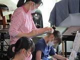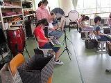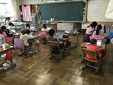 コロナ対応で,鍵盤ハーモニカの代わりにミニキーボードを使っています。課題ができた人は手をあげて,草間先生に見てもらいます。楽譜と鍵盤をかわるがわる見ながら一生懸命練習しています。担任の高坂先生も応援で授業にはいっています。