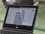 各自の端末に,おぼろ月夜の楽譜や表を表示し,自分の考えをタッチペンや付箋を使って書き入れます。課題が終わったら,データを先生に提出します。前の大型ディスプレイには全員のデータが表示されています。