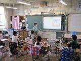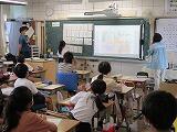 1年生の算数は,「あわせていくつ ふえるといくつ」の単元です。教科書の絵を実物投影機で黒板のスクリーンに映して,説明をしています。