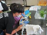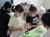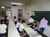 6年生は総合的な学習の時間を使って,縄文人体験をしました。今日は黒曜石を割ったり,砕いたりして,やじり,ナイフ,アクセサリーなどを作りました。大きな黒曜石をハンマーや金づちでたたきます。けが防止のために手袋やゴーグルをつけ,黒曜石にも飛散防止のために布をかけて作業にあたります。砕けた破片はとても鋭く,本当の刃物のようです。紙がスパッと切れる様子を見て児童はびっくりしていました。2時間でいろいろな作品ができました。