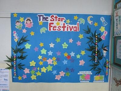 外国語支援員の長谷部先生とALTのリチャード先生が作ってくださった「The Star Festival」の掲示物です。星の数が増えましたね☆