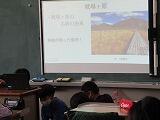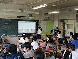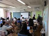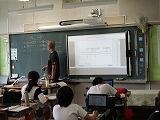先週,小グループ内で発表練習したプレゼンを全体の場で発表しました。司会の進行で前に並んだ発表者からのプレゼンが始まります。写真を入れたり,アンケート結果をグラフにしたり,工夫が見られますね。