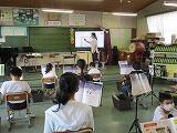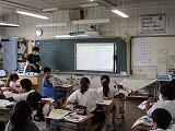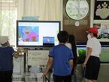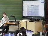 1年生の音楽は,曲にあわせて手でリズムをうつ練習です。大型ディスプレイに映し出された歌詞を見ながら元気良く手拍子をうちます。後半は,シロクマの親子の泳ぐ映像を見て,イメージを膨らませました。