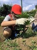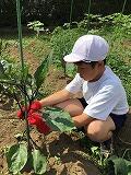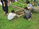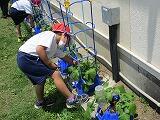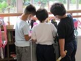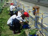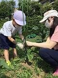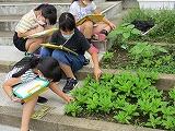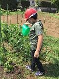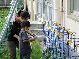 体育の後は,アサガオのお世話をしました。だいぶ大きくなってきたので,支柱を取り付け,粒状の肥料をあげました。
