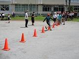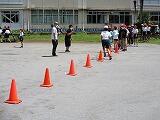 6年生は「チャレンジスピード」を選択しました。行きはまっすぐ走り,帰りはコーンをジグザグに走って戻り,次の人に交代です。総合タイムから,1人1人の平均をだし,それがクラスの記録となります。