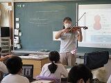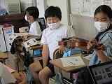 5年生は教室で音楽の授業です。今日のテーマは「いろいろな弦楽器」です。教科書には,バイオリン,ビオラ,チェロ,コントラバスなどがあります。児童は,教科書や端末を使って調べたり,実際に,バイオリンに触れたりして学習を深めました。