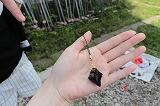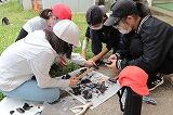 6年生は総合的な学習の時間を使って,縄文人体験をしました。今日は黒曜石を割ったり,砕いたりして,やじり,ナイフ,アクセサリーなどを作りました。大きな黒曜石をハンマーや金づちでたたきます。けが防止のために手袋やゴーグルをつけ,黒曜石にも飛散防止のために布をかけて作業にあたります。砕けた破片はとても鋭く,本当の刃物のようです。紙がスパッと切れる様子を見て児童はびっくりしていました。2時間でいろいろな作品ができました。