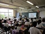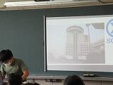 先週,小グループ内で発表練習したプレゼンを全体の場で発表しました。司会の進行で前に並んだ発表者からのプレゼンが始まります。写真を入れたり,アンケート結果をグラフにしたり,工夫が見られますね。