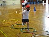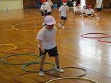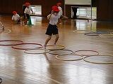 次に,3コースに分かれて,片足跳びと両足跳びの組み合わせた動きです。置いてあるフラフープの輪に合わせて跳んでいきます。