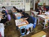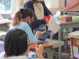 今日はボタン付けの実習です。全体への説明の後,実習に入ります。できる人はどんどん作業を進めていきます。やり方が不安な人は,先生に質問したり,わからない部分の動画を繰り返し見たりして,確認してから進めています。