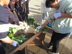 5年生は、1学期から夏休み明けにかけてお米作り。10月末からは野菜づくりに取り組んで、社会科で学んだ日本の農業をきっかけに、富勢の農業について探求的に学びながら農家のお仕事を体験しています。今日は、実際に収穫して売れる状態にするためには、どのような工程があるのかを実体験を通して学び、9日の直売会に備えていきました。
