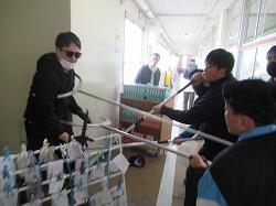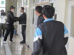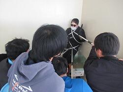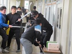 今日は、第1校舎の4階に不審者が現れたという想定で、担任の先生の声かけ対応⇒パニックベルによる通報⇒不審者が凶器を持っている⇒さすまたを使っての取り押さえ⇒警察官への引き渡し、その間に全教室では、不審者が教室に侵入できにくいように、机でバリケードを設置する、という内容の訓練です。