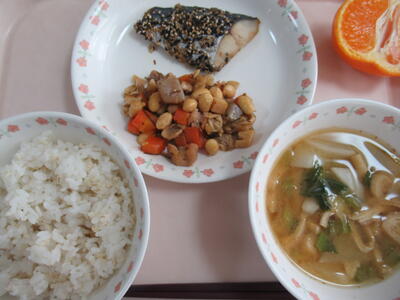 今日は和食献立で、気温が高く小春日和の日にちなんだのか、鰆と春の魚の香味焼き。鰆は春だけかと思いきや、寒鰆と12月からの冬も旬になっている。脂がのっているのが寒鰆で、今日はゴマががたっぷりと振りかけられて、おいしく焼けている。五目豆は、大豆と同じような大きさににんじん、たけのこ、油揚げ、こんにゃく、鶏肉、昆布と煮込まれていて、一つ一つを丁寧に箸で取りながらゆっくりと食べる。今日はこんにゃくが話題になっており、こんにゃくは芋の仲間と紹介されていたが、そのこんにゃくは二つしか入っていなかったのが、残念。カブの味噌汁は、カブの葉も一緒に具になって、カブ一体となっての味噌汁で、カブの実の味と香り、カブの葉の歯ごたえを楽しむ味噌汁であった。みかんは、半分をたっぷりと食べられておいしかった。