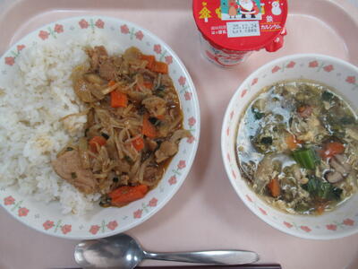 今日は中華、韓国料理の献立で、プルコギと酸辣湯。プルコギごはんは、豚肉がたっぷりと入り、醤油ベースの甘辛タレの味でたまねぎ・にんじん・もやし・たけのこと野菜たっぷり具沢山のプルコギで、ごはんとしっかりと合って大変おいしい。酸辣湯は、思ったほどに酢っぱくなく、こちらも小松菜・にんじん・しいたけ・ネギともずくが加わり野菜がたっぷりのスープに仕上がっている。ここのところごはんの残量が10%から20%と多くなっているので、プルコギごはんで少しお米をしっかりと食べて欲しいと思う。ヨーグルトのデザートには、サンタのシールが貼られて、クリスマス気分を出している。