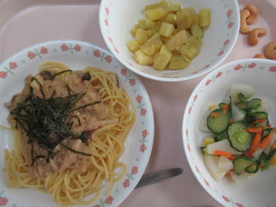 12月10日 大根とツナのスパゲティー かぶのサラダ サツマイモとりんごの甘煮 炒りカシューナッツ