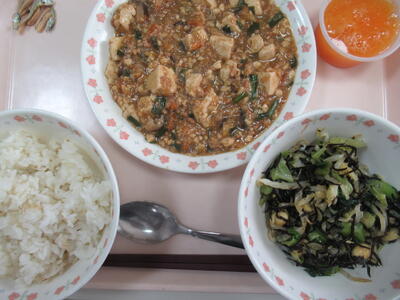 12月11日 麻婆豆腐 大豆とひじきのサラダ キャロットオレンジゼリー アーモンド小魚