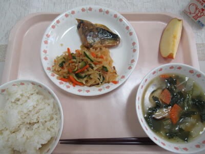 12月12日 サバの味噌煮 かむかむ和え かぼちゃの団子汁 りんご