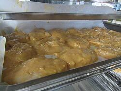 タンドリーチキンは、カレー風味がおいしく、鶏むね肉が焼き上げられている。サラダは、ゴマ風味でブロッコリーとサツマイモを賽の目に切った甘味と、野菜たちがおいしく絡んでいる。とてもおいしいのだが、実は残渣は大変多いのが残念。スープは米粉を使って、かぶをふっくらとゆで上げて、おいしいスープになっている。