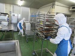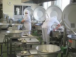 今日は2学期の給食最終日。クリスマスメニューで、タンドリーチキンに彩り鮮やかなサラダに雪を思わせるスープと、温かさを感じる献立である。給食室では、丁寧に調理が行われていました。