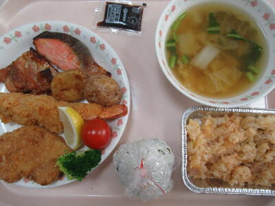 主菜 エビフライor鮭の塩こうじ焼 and ヒレカツorローストチキン