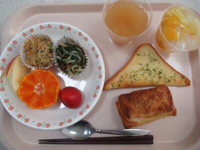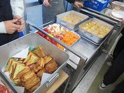 今日はバイキング給食。6年生だけのとっておきメニューである。主食は2つを選び、わかめごはん・キムチチャーハンのご飯類はどちらも味があるおいしいごはん、パンはガーリックトーストとデニッシュパンで、ガーリックトーストは主食系であるが、デニッシュは甘さも強く少しデザート系に思われた。主菜は、エビフライか鮭の塩こうじ焼きandヒレカツかローストチキンと魚系肉系から選ぶ。エビフライも塩こうじもどちらもおいしい、ヒレカツとローストチキンもそれぞれにしっかりとした肉の味を楽しめる。切り干し大根の煮物と磯か和えは、磯か和えが海苔の香りが薄くなってしまい、切干の煮物に様々な具材も多く、切干に軍配をあげたい。かぶやはくさいの柏野菜の味噌汁は、優しい味でおいしいが、子供たちにお代わりを勧めたがなかなか難しい結果であった。デザートのリンゴ、みかん、いちごはどれも甘さもジューシーさもおいしく、ピーチゼリーには、白桃缶のおいしさを味わうゼリーで、サイダーポンチは数種類のくだもの缶にサイダーのおいしさがしっかりと合うデザートであった。合計1283Kcalをいただいてしまった。