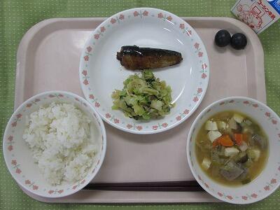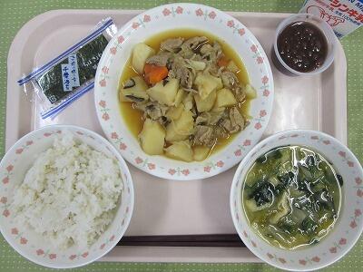 牛乳・ごはん・いわしの土佐煮・からし和え・いもの子汁・ぶどう